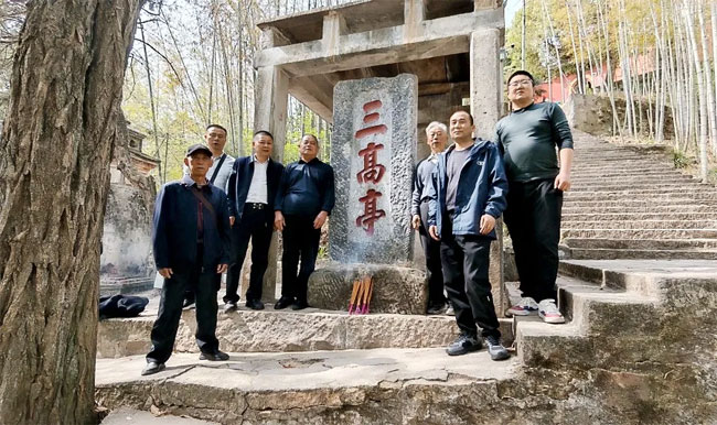 午后,何茂银一行在何彦龙、何良赴的陪同下来到位于三祖寺内的“何氏三高亭”拜谒。这座禅寺碑亭是为纪念南朝隐士何求、何点、何胤的高风亮节而建。该亭始建于明正德年间,后经乾隆、嘉庆间两次重建,保存至今。亭为全石结构,四柱,南北跨2.25米,东西距2.4米,高3.5米。亭顶用7块平石板铺就,脊两端有石雕鳌鱼翘角。下方有重修、三修亭记,二碑分列南北两侧。西侧两根石柱上镌有民国七年(1918)何氏后裔何雯的长联:“长揖傲夷齐,看山外白云,招隐共诗崖酒岛;所居在廉让,访洞中丹灶,编书续高士神仙”。