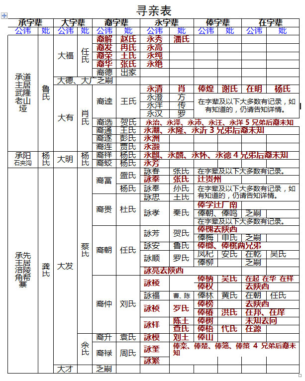 我支现主居重庆涪陵角帮寨、石夹沟和武隆老山垭(地图显示为涪陵区武陵山乡与武隆区羊角镇交界地带),开基始祖何(登衢)吴氏,属思南九祖第三房永祥公后裔。明朝末,登衢祖逝世后,吴氏祖婆携承道、承阳、承先三兄弟由贵州沿河迁此,之后开支散叶。字辈为:天开立定胜,明伯应帮绍,一(崇)登腾大裔,永俸在朝廷。洪福保贵仲,元亨利贞诵,兴旺正国顺,世代享荣华。目前已发展衍生到仲字辈。由于多年未续记老谱,人员不断外迁,导致部分分支(特别是永、俸两辈后裔外出)失联待考。现请见者帮忙,如有知道其中分支者(如字辈相同)或者本身属以下支系后裔,与我联系(电话:13594502806),并将世系表发我403252573QQ邮箱或个人微信。谢谢!