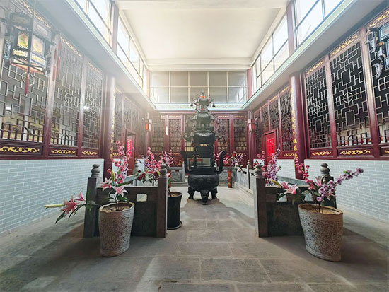 穿过厢屋的走廊,来到后进正殿--祭祀殿(祖先堂)。正殿地面铺有青石地砖,照壁上木雕"福、禄、祷、禧”。照壁下四根金龙抱柱,堪称雕刻极品,彩绘绝伦。正殿上方挂着五位先祖像,正中间悬挂一始祖保什公像、两边分别是二始祖庆一公、庆二公、庆六公、庆九公。先祖像的下方是牌位塔,何氏列代先祖的牌位井然有序地敬列其上,庄严肃穆。