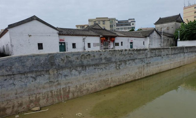 老围前面的泮月池蓄了水,远处是农田,何氏宗祠已经有三百多年历史了,宗祠的右侧是石井何氏炮楼院,它与宗祠隔着一条古色古香的巷子。