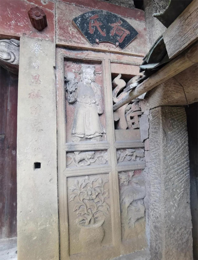 门枋上方横嵌着一块石匾,上书“尊祖敬宗”,左右两侧分别刻有“祖德同天地”和“宗功合古今”,彰显了宗祠的庄严与神圣。石墙上方阴刻着“何氏宗祠”四个大字,显得格外醒目。