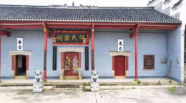 衡阳县长乐何氏宗祠始建于清1864年(同治三年),坐东朝西,三进三横,青砖木结构,风火墙,盖小青瓦,宗祠深40米,宽22.5米,建筑总占地面积约900平方米。前出柱廊,穿斗式抬梁,庐和穿斗上雕刻精美吉祥图案。外墙青砖还刻有“同治三年十二月**造”字样,三进大门两侧均为浮雕“双狮戏球”石质框柱,不过在文革中被凿破,第一进正中大门左右各摆放“鱼跃龙门”图案抱鼓石,上方悬挂“何氏宗祠”牌匾,左右进门上方分别有“克己”“奉公”字样。第二进中厅为木结构建筑的钟鼓楼,上挂“族兴家荣”匾额。