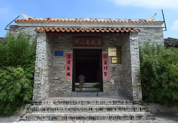 何以尚故居座落在广西兴业县石南镇东山村南端,上下两进,开三间,两侧建廊庑,中间隔天井,大门外置大院。建筑结构为青砖包墙,砖木结构。整体建筑朴实无华,古香古色。简洁的格木屏风,庄重的“圣世贤卿”牌匾,每个细节无不与主人的精神品性和谐结合。