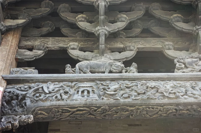 后堂宽三间深两间共十五槫,前廊卷棚,四根鸭屎石八棱檐柱,次间与明间用砖墙相隔,明间有神龛供奉何氏历代祖先。