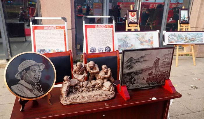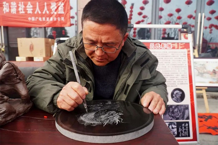 在游园会现场,还有雕刻在岩石上的影像——“吕氏影雕”,作为东至县的传统民间艺术,其传承人吕云峰的作品已达到形神兼具的境界,其大胆创新,运用独有的艺术形式,所创作的人物肖像惟妙惟肖,远看似一幅黑白艺术照片,近看却有着照片所不能传达的神韵。吕云峰在展览中现场制作,将人物的眼神、表情恰到好处地呈现,游客观后纷纷表示意犹未尽。