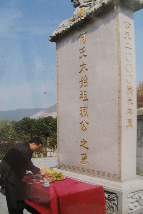 参观完何氏太始祖陵园,我们在陵园门前停留,目视远方,但见陵园前面阡陌纵横,农田肥沃,稻浪飘香。据当地人说,明末清初,这里住着最后一户姓何的 人家。这户何氏人家在当地是望族,“何坟岗”前的1000多亩水田全部归何氏所有。但突然有一天,山贼将一具死尸放在何家大门前,并放言如不给钱下场如 此,何家怕招来杀身之祸,当晚就悄悄从后门逃走,从此之后,这一带再也不见何姓人家。听到这个曲折凄凉的故事,联想当年何瑊归隐在此、卒葬在此的种种事 迹,再回望那陵园最高处高高竖立的墓碑,不由觉得那不仅仅是何氏宗亲们竖起的一块普通的墓碑,而是一座凝结着中华大家族血统的丰碑,一座天下何氏宗亲们心 中共同的丰碑。