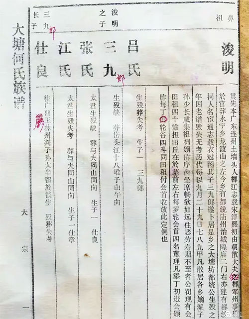 今逢民族团结,社会和谐,交通、信息快捷,经济繁荣的昌盛时代,郴阳大塘何氏族人均有一个念头:“寻根问祖”,查清鼻祖浚明公的祖籍地连州土墙头在哪里,经多方论证:始祖谏议公,原籍江西吉安府之庐陵白鹭州,是北宋真宗景德年间由科甲起家任东院谏议大夫,因立朝骨鲠常直言极谏,而见忤于朝庭。本人龙氏惧祸及家庭,遂携子监丞公离京远避,以传宗嗣。南行至桂阳(今汝城),便卜居于城东马坎岭之砖街头。后监丞公生五子。三子荣十三郎生九子,长子名知亮。知亮生子五十二郎,讳先觉,字名师,榜进士,知广东连州。先觉生子四八郎,讳岩老,字惟霄,广东雷州府司法参军。四八郎生二子,长子季二十三郎,字耘叟,寄居攸州明月岭,后无考;次子季三十二郎,亦无考,按世系至第七世。