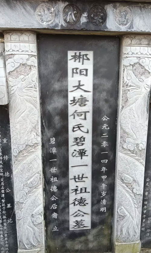 郴阳大塘何氏鼻祖浚明公,其先本广东连州土墙头人,宋淳熙初由朝散大夫知郴军州事,亦称都统。公卒于官,葬永宁乡龙渡山之左,其子三九郎公遂卜居大塘坊(今村头村)。