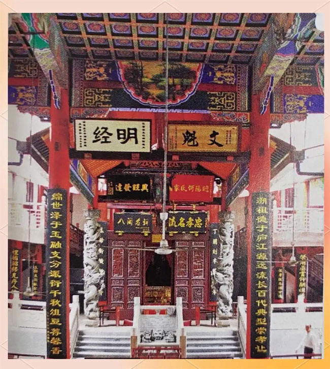 厅中还挂有一副对联:“溯祖德于庐江,源远流长,百代典型崇孝让;绵世泽于玉融,支分派衍,千秋俎豆荐馨香。”此外,厅边墙的半圆形砖柱上还悬挂着一副对联:“千秋伟业唯有安邦为重,百世宏图务须爱国领先。”
