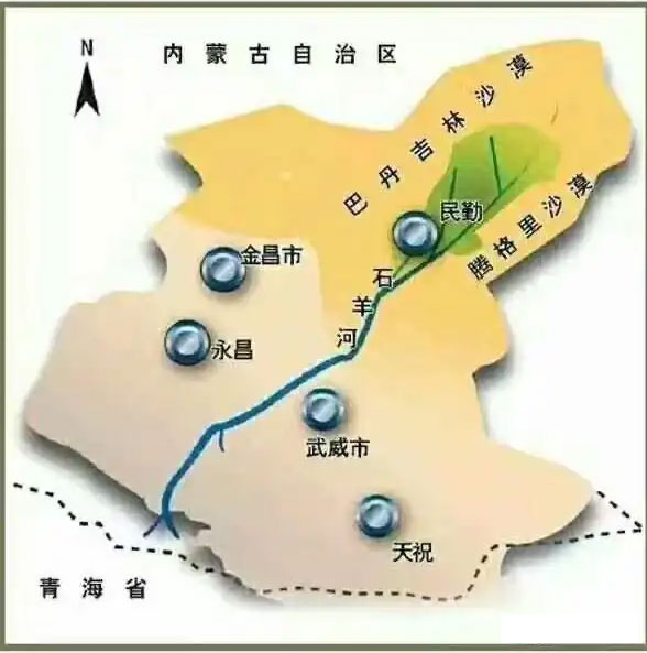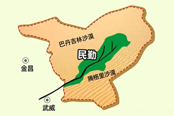 在浩瀚的巴丹吉林沙漠与腾格里沙漠的结合处,有一片呈叶片状的绿洲像一个巨大的楔子嵌入沙漠深处。这片绿洲长140公里,最宽处约40公里,面积为0.18万平方公里。这就是当下的民勤绿洲。民勤绿洲和三面环绕的沙漠一起构成了一个行政区划,就是当下的民勤县。在明清两代,民勤则被称之为镇番。