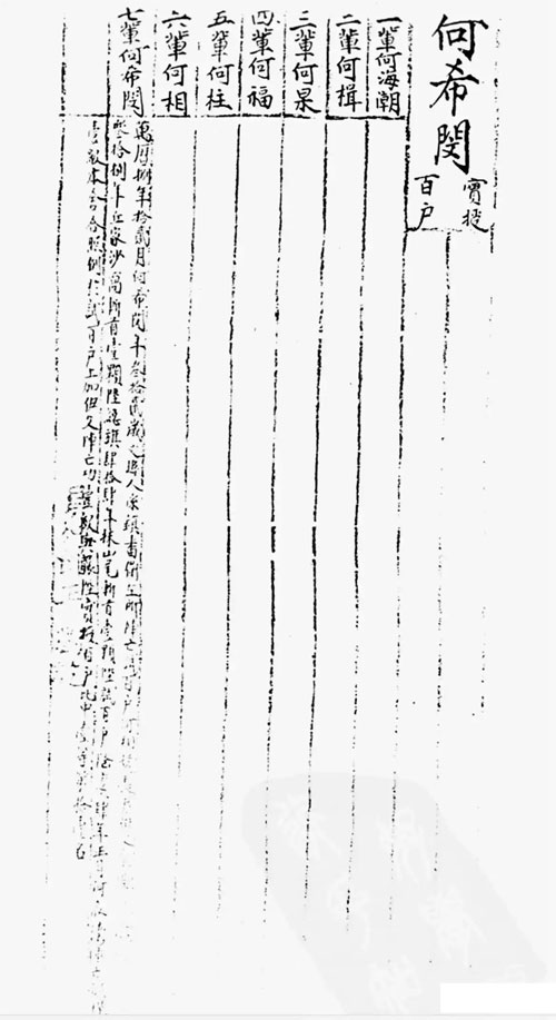 七辈何希闵,万历八年十二月,何希闵,年三十二岁,文县人,系镇番卫左所阵亡试百户何相嫡长男。伊父原袭祖职补役小旗,嘉靖三十八年丘家沙窝斩首一颗升总旗,四十四年抹山尾斩首一颗升试百户,隆庆四年正月何家湾阵亡,袭升一级。本舍合照例于试百户,上加伊父阵亡功一级与袭升实授百户,比中一等第一名。