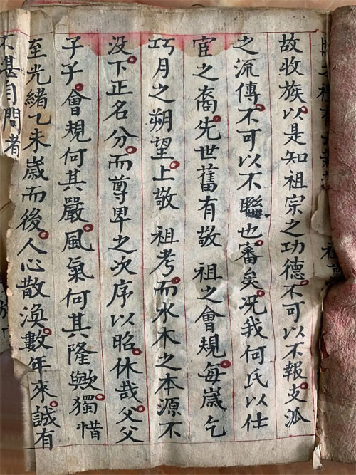 其余所查确者详录之而无孑遗,且其布置清楚,伯仲有序,脉络分明,丝毫不紊也,如过继之子,承祧之嗣,随手批悉,俾后之览者,一目了然。自此以往,约十年而修之,定为成例,不得改易。凡属同宗,皆系一脉相传,须对亲亲长长,尊礼以敬之,子子孙孙,执法而教之,庶家门整饬,矩度常昭自鲜,浪荡匪僻之子弟,堪为安分循礼之善良,家乘之关于伦常世教者,不綦重哉?