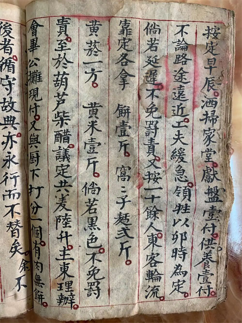 一遇每年七月初十日,按定数门人,靠定牲羊一只,烧纸三刀,千章一捻,奠酒四钱,清油四钱,中香半把,黄表壹拾贰分,黄烟半方。按定早辰,洒扫家堂,献盘壹付,供养壹付。不论路途远近,工夫缓急,领牲以卯时为定。倘若延迟,不免罚责。又按一十余人,东客轮流,靠定各拿饼壹斤,窝窝子面二斤,黄烟一方,黄米一斤,倘若黑色,不免罚责。至于葫芦柴醋,议定共小麦陆升,主东理办。会毕公摊现付。又与厨打分一个,有肉无饼。
