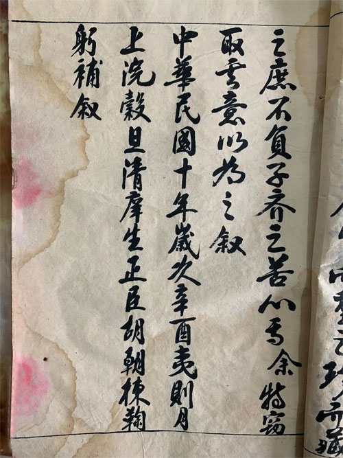 中华民国十年岁次辛酉夷则月上浣谷旦清庠生正臣胡朝栋鞠躬补叙