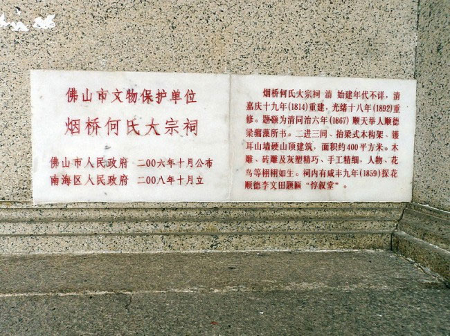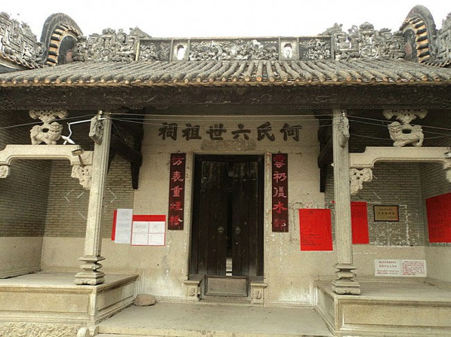 “何氏六世祠”是烟桥村6间祠堂唯一保存的一间。大门梁柱上石雕、木雕、灰雕和砖雕搭配,样式乃清末典型繁琐而精致的风格,宗祠建造得十分坚固,据称瓦顶亦有五层,子弹亦无法穿透。