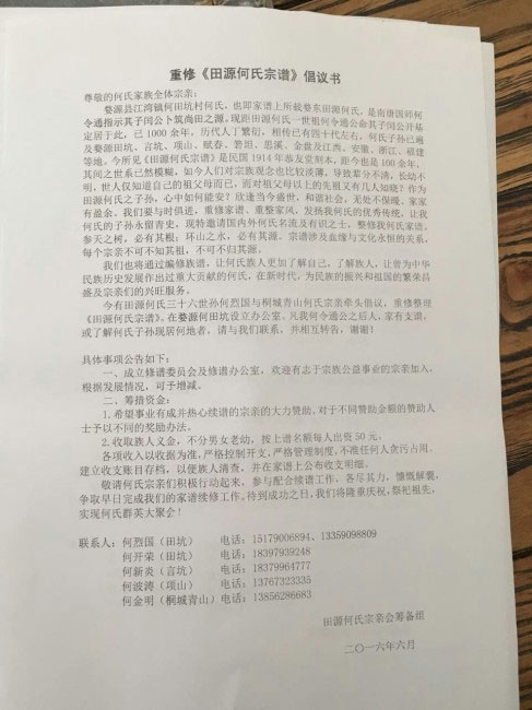 重修《田源何氏宗谱》倡议书