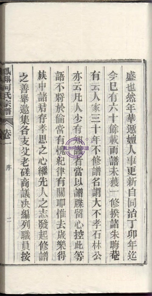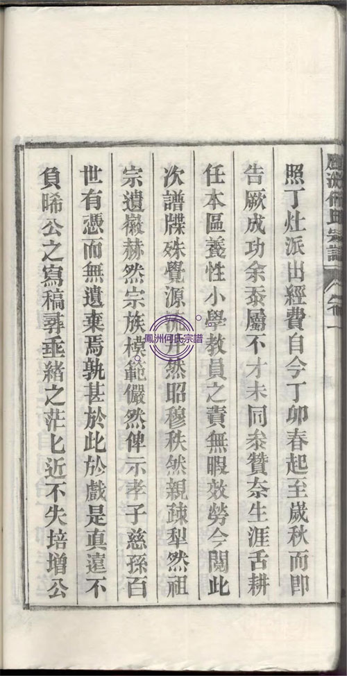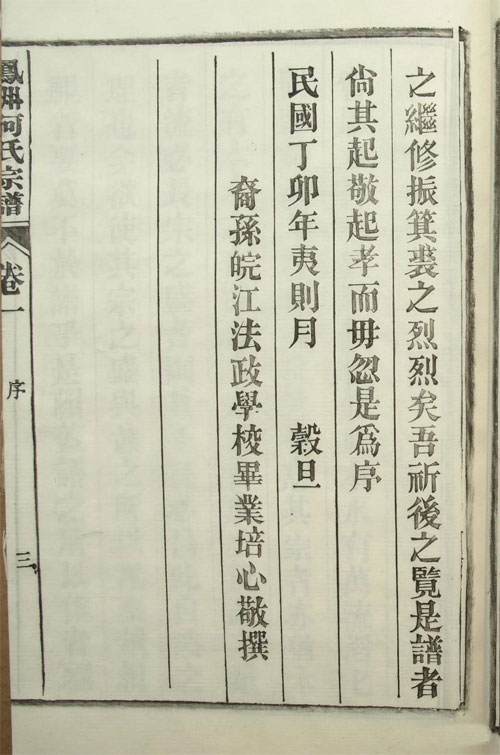 然年华递嬗,人事更新,自同治丁卯年迄今已有六十余载而谱未获一修。揆诸朱晦庵有云:「人家三十年不修谱名,谓大不孝。」石林公亦云:「凡人家少有知识者,当以谱牒留心控此等语。」不将于伦常有愧,纪律有关耶?惟去岁乐得族中诸君存孝思之心,继先人之志,发起修谱之善举,邀集各支父老磋商议决,编列职员,按照丁灶派出经费,自今丁卯春起至岁秋而即告厥成功。