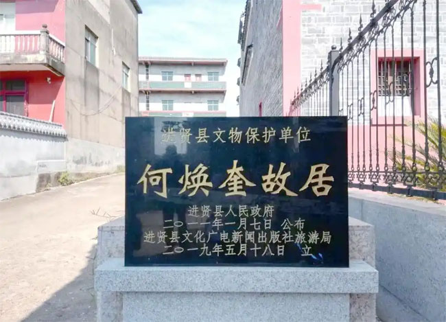 沿昌万公路前行两三公里,我们抵达了何博士的故乡——何家村。这里,社会名流、作家兼诗人何安山热情迎接并带领我们参观了位于村中央的何博士故居。故居旁,一块“何焕奎故居”的标志牌静静伫立。这座故居以灰砖为主体,辅以红石腰墙,马头墙的设计更增添了古朴韵味。在炎炎夏日里,它宛如一股清泉,带来丝丝凉意。亚门上,“何焕奎纪念馆”的匾额熠熠生辉,而正前方,何焕奎博士的雕像肃然矗立。灰色基座上,银光闪闪的几行大字诉说着何博士的智慧与理念:“人类最高尚最机敏,是在能运用适应环境的办法——何焕奎”。