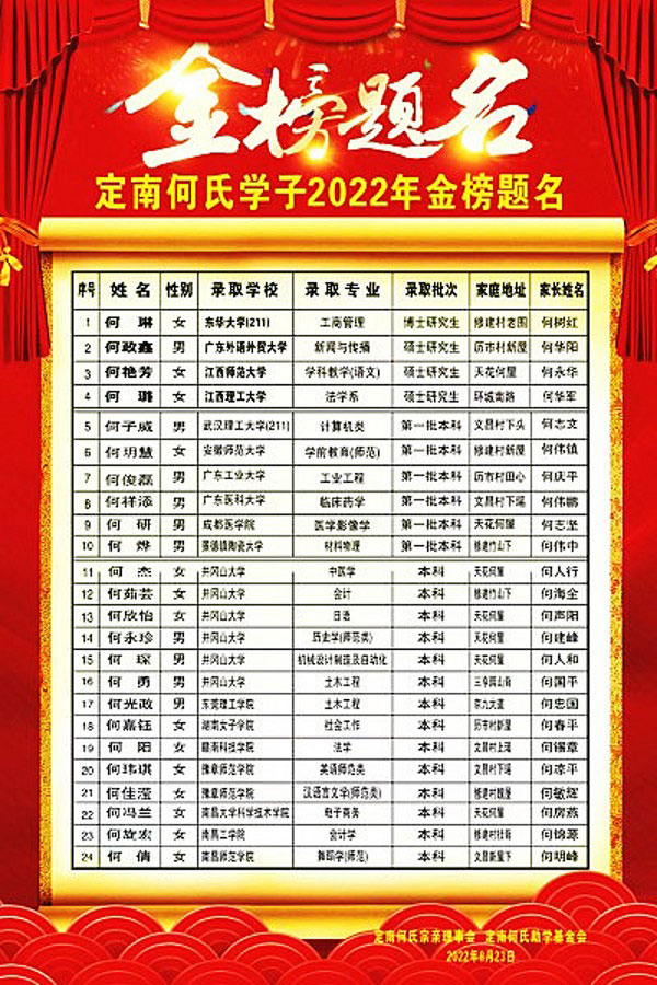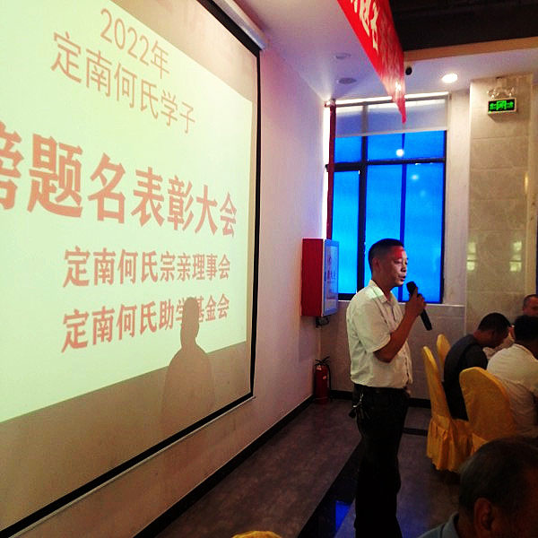 2022年8月25日上午,江西赣州市定南县何氏在县城凤凰国际社区“湘遇赣南主题餐厅”举行“2022年定南何氏金榜题名表彰会”,表彰奖励今年研究生和高考录取的新生共23名,其中,研究生3名,第一批本科5名,本科15名。优秀学子及其家长代表、部分理事会主要成员、企业家与宗亲代表50余人参加了会议。赣州市何氏文史研究中心常务副会长兼秘书长何鹏万,常务副会长、于都县会长何建平应邀出席会议。