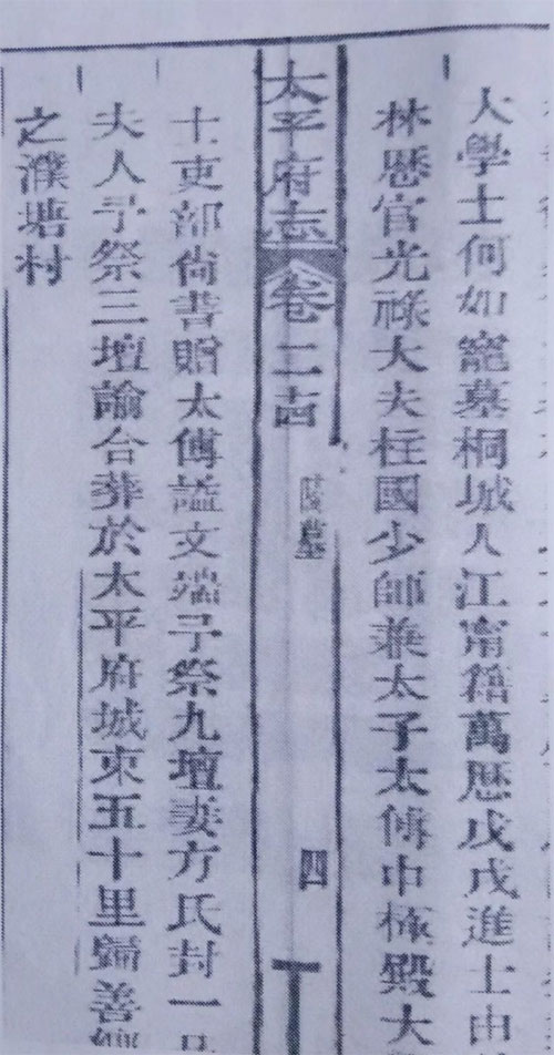 清康熙《太平府志》:大学士何如宠墓,桐城人,妻方氏封一品夫人,合葬于太平府城东五十里归善乡之濮塘村。