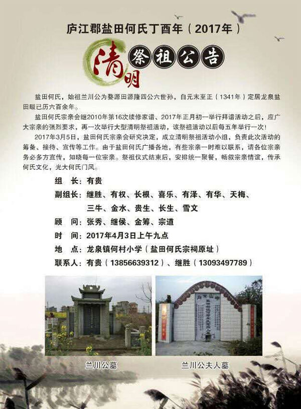 庐江郡盐田何氏丁酉年(2017年)清明祭祖公告