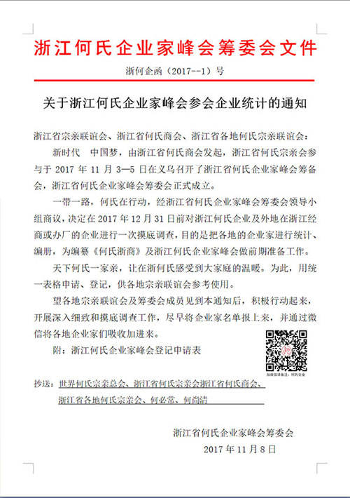 一带一路,何氏在行动,经浙江省何氏企业家峰会筹委会领导小组商议,决定在2017年12月31日前对浙江何氏企业及外地在浙江经商或办厂的企业进行一次摸底调查,目的是把各地的企业家进行统计、编册,为编纂《何氏浙商》及浙江何氏企业家峰会做前期准备工作。