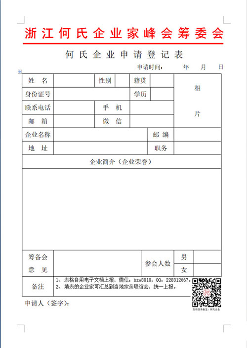 天下何氏一家亲,让在浙何氏感受到大家庭的温暖。为此,用统一表格申请、登记,供各地宗亲联谊会参考使用。