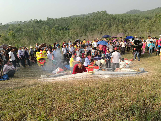 28日时值秋高气爽,烈日炎炎,早餐过后板桥何氏宗亲备置猪羊等祭祀贡品,与外回宗亲一同前往广西博白万隆公墓祭拜万隆公,下午回板桥村阿婆岭祭拜万隆祖妣冯氏祖婆。下午四时祭祖完毕宗亲们一起在板桥文化楼前聚餐。