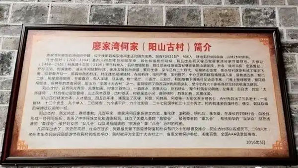 阳山古村最早是廖姓人家居住的庄子,原叫廖家湾。何姓人迁徙此地后,不知从什么时候起,廖姓人家迁出了村子,仅留下何姓一族。如今阳山古村118户,人口约500,98%姓何。为感恩,何姓人习惯上称自己为“廖家湾何家”,也曾一度把村名叫“料材”,除了祈求人丁兴旺、人才辈出外,“料”“廖”谐音,也有感恩廖家的意思。因为村子倚着中国南岭山系五岭之一的骑田岭,秦时称阳山,故廖家湾改名阳山。