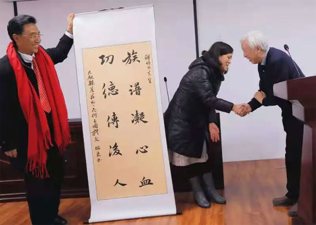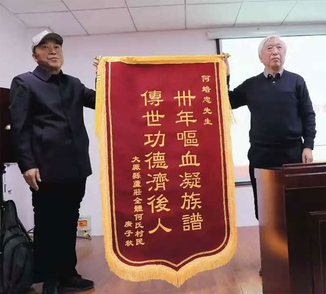 何培忠研究员从青丝飘逸到须发皆白的修谱过程得到何氏宗亲的敬佩,为此,何氏宗亲为何培忠研究员送上题辞、锦旗。