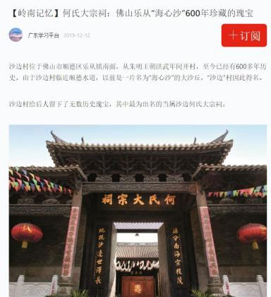 近日,“学习强国”广东学习平台以《何氏大宗祠:佛山乐从“海心沙”600年珍藏的瑰宝》为题,报道了被列入广东省文物保护单位的乐从何氏大宗祠。