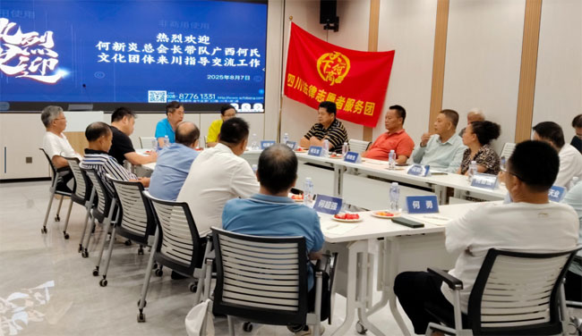 2025年8月7日,何新炎会长带队广西何氏文化团体到达第二站四川法邦律师事务所与四川何氏宗亲总会携手召开文化交流座谈会。