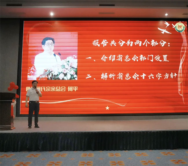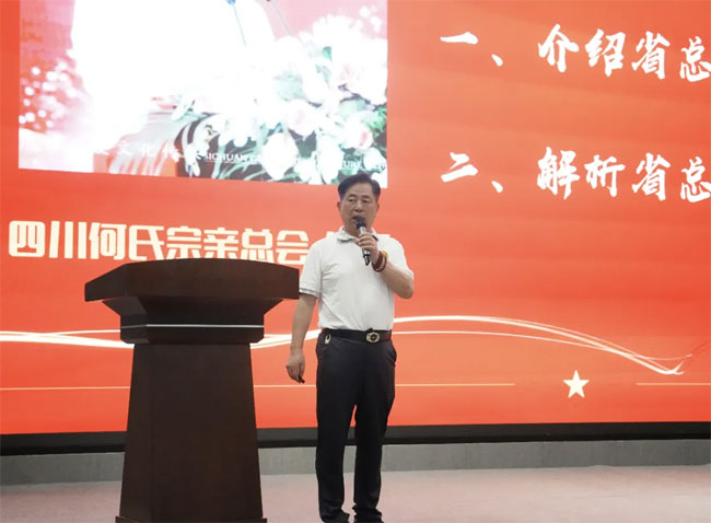 活动伊始,世总会副会长、省总会会长何平在会议中回顾了何氏大家族的光辉历史,对未来进行了展望,并分享了四川何氏总会的近几年的工作成果及十六字方针,详细介绍了各部门的成果及目标,并号召更多的年轻人积极投身于建设何氏大家庭的 建设当中,为四川何氏大家庭贡献出自己的一份力量。