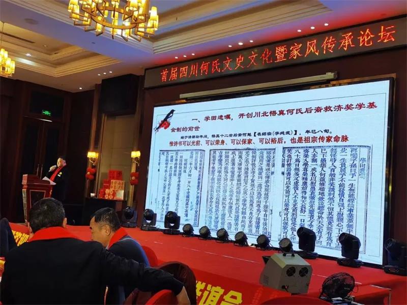 《聚首蜀地话家史. 何氏德风启新程》首届四川何氏文史文化暨家风传承论坛启动。省总会文史研究会长何昌荣主持。来自蒲江何氏宗长何正源、绵阳何氏宗亲何梁霆、巴中何氏秘书长何鹏章、成都青白江宗长何登赶以及湖南郴州何国霆宗长在论坛上做了主题分享。