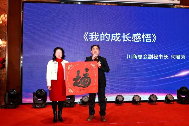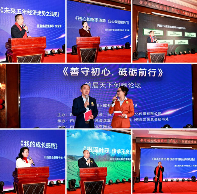 以“销售+文化”于一体为代表的四川蒙娜丽莎董事长何晓勇《初心永驻,勇往直前》、四川锦庐酒业公司创始人何文卿《初心如磐系酒韵、归心似箭耀何门》、以政府资源型与跨境视野的蓝盔集团董事长何全军《未来五年经济走势之浅见》、以趋势为导向、央企混改智能领域的厦门航天思尔特创始人何昌鸿《新经济形势面对的挑战和机遇》、以始终致力于服务战线的川商总会副秘书长何君秀《我的成长感悟》,以及刚刚从省人大第十四届预备会现场赶来的米仓山茶业集团 董事长何旭伦携着他的《根深叶茂、传承不息》主题在现场做了主题分享。