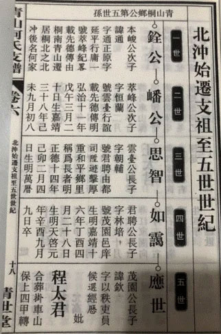 五、怀宁云田何氏源流:先世何绛,字宣彩,是何桢的二十九世孙。何桢在大同谱中位于第17世,可知何绛在大同谱中的世次应是第45世,那么迁怀宁云田的一世祖何显卿是何允的第56世孙。