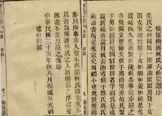 四、皖桐何氏,目前只见有一套民国年间的老谱存世,持谱人在范岗西边月山附近村庄居住。该支何氏于乾隆戊戌(1778年)第一次修谱,怀宁籍乾隆朝进士丁田树作谱序。元季时讳鼐,号添泷者,舍豫章,弃婺源,迁桐东青山,再迁桐南。鼐弟讳鼒,也随兄迁桐城南边的新渡九重而居焉。其间在嘉庆戊午(1798年)又修了一次谱。