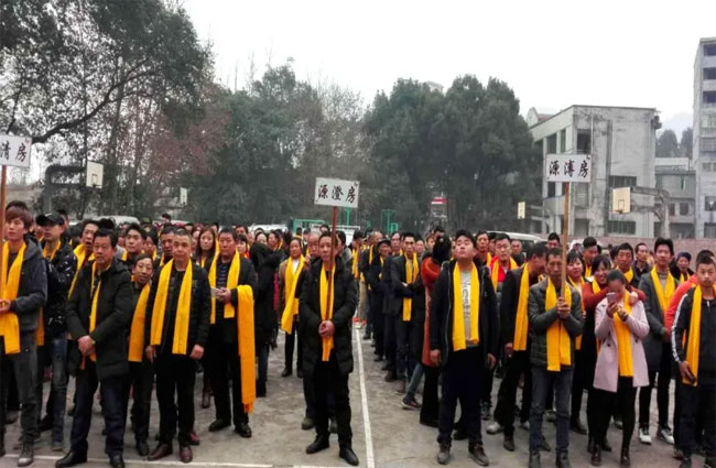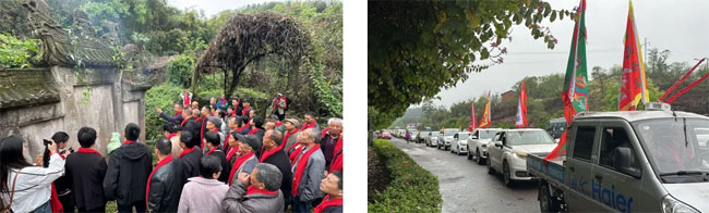 (宜宾何氏宗亲会秘书长何平 报道) 4月4日,何氏大荣公系清明祭祖活动在翠屏区李庄镇举行。清明节早上,何氏家人们从四面八方冒雨来到李庄汇源饭店聚集。在李庄何氏族长何焕祖的带领下,理事会成员分工合作,组织工作严谨有序,200多人分乘二十多辆汽车、三轮车、摩托车从李庄镇出发前往孟家林入川始祖李老太君墓地、国祥公夫妇墓地、老林山学登公墓地、黄耳岩昌凤公墓地、兴璠公之妻李明法太君墓地祭拜,共同参与这一庄严而隆重的祭祖仪式。
