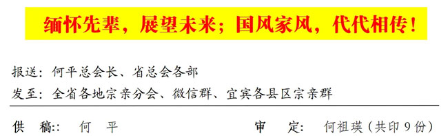 天下何氏一家亲,世界何氏一脉承。今天我们相聚在一起,共同缅怀何氏先祖的大恩大德,我们不忘感恩,不忘传承!今天的祭祀就是为了更好传承让更多的何氏子孙后代不忘祖训,守正创新,承前启后,继往开来。我们要遵循四川何氏总会“共叙亲情、共享资源、共济族人、共襄发展”的十六字方针,团结一致,聚心聚力,倡导爱国爱家理念,弘扬厚德载物精神,让中华民族传统美德承先启后,代代相传,为实现何氏家族家风家训发扬光大而共同努力!