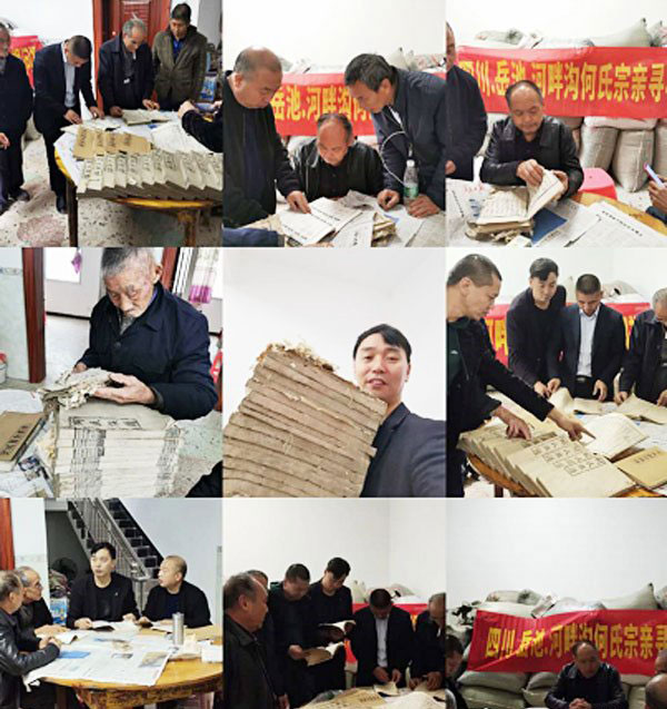 次日清晨,我们与祖地亲人共同查阅老谱书,核实了我族入川支系何希豪先祖为江西入湘始祖(何氏)胜源公之后裔。一世:何胜源(长子:何宽,次子:何廣,三子:何祥),二世:何廣(长子:何永顯,次子:何永達,三子:何永福),三世:何永達,四世:何世祖,五世:何德俸(长:何大坤,次:何大伸),六世:何大坤(长子:何学文,次子:何学武,三子:何学举),七世:何学举(长子:何希宣,次子:何希华,三子:何希豪,四子:何希雄)。八世:何学举的四个儿子均奉旨入川,入川后未记载,查阅到我支系于康熙36年(1697年)何学举之三子何希豪携妻董氏带三个儿子入川,何希豪在入川途中病故(入川后的记载)。