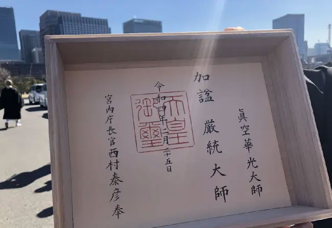 为纪念福建福清来的日本黄檗宗宗祖隐元禅师圆寂350年,2022年2月25日,日本皇室为其加封谥号——严统大师。当天日本宫内厅向日本黄檗宗颁授的文书依然保持汉字公文体裁的传统,内容为:“真空华光大师,加谥严统大师。令和四年二月二十五日。”