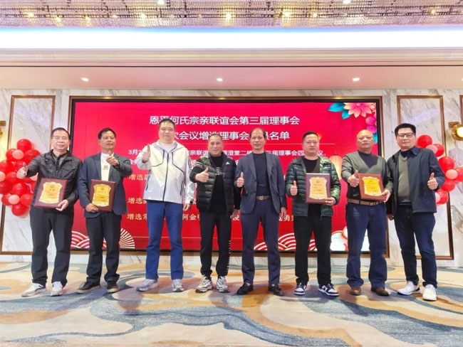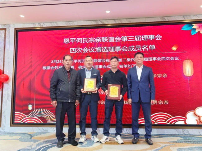 当日大会还对在3月28日宗亲会三届理事会四次会议上增选为理事会成员的8位宗亲颁发了任职证书,他们是:何琪练宗亲、何平一宗亲、何少华宗亲、何首锋宗亲被增选为副会长;何勤伟宗亲被增选为副监事长;何金明宗亲、何俊扬宗亲、何庭勇宗亲被增选为常务理事。上述宗亲多年来热心何氏事务,乐意为何氏奉献,他们的加入,必将为理事会增添新的活力。