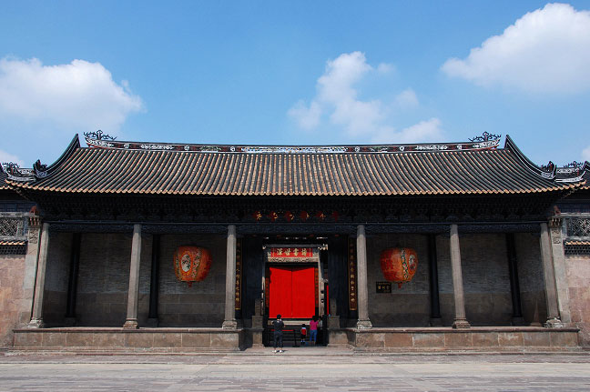初来乍到留耕堂的游客,即使是在远处,也应该能够感受到留耕堂的非凡气派。门前一口四四方方的大池塘,池塘后大埕(天街)上林立的旗杆石,无不昭示着这座祠堂所代表的家族在当地的权势和名望。就连祠堂山门两侧悬挂的那对超级大灯笼,都能告诉人们一段有关何氏的显赫家世。