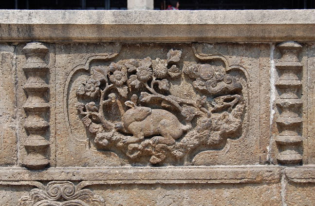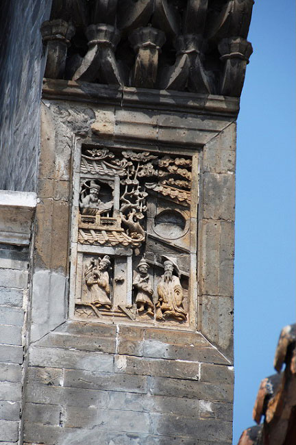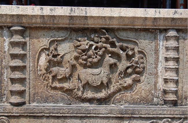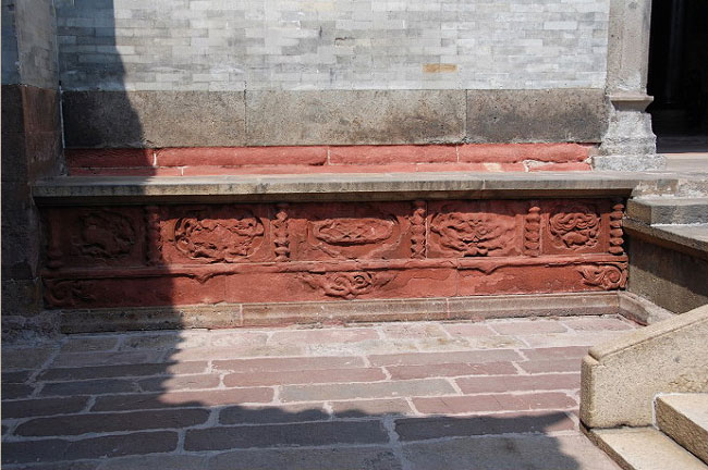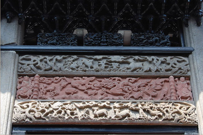 第三进拜庭面阔五间,进深三间,硬山顶。东西两墙砖雕精美,墙基各有五幅大小不等的红砂石雕刻,风化比较严重。