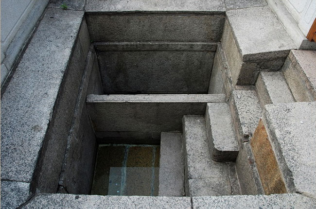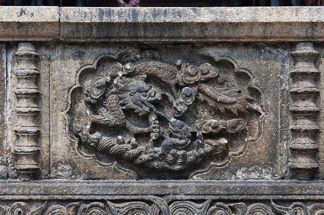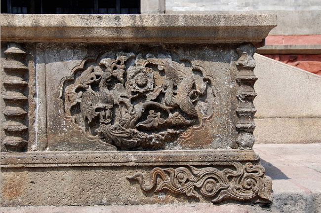 第二进除了仪门外,还包括门后的丹墀(天井)、月台和东两边的庑廊。天井由红砖铺成。月台(又称钓鱼台)在天井的正北面,高出天井1米,原是族人在喜庆日 子看戏的舞台。台基束腰由一列15块大理石构成,刻有“老龙教子”、“双凤牡丹”、“双狮戏珠”、“犀牛望月”、“苍松文理”及松、梅、竹、菊、牡丹等图 案,是元、明年间的旧石雕。东西庑廊各有4条石柱、8条木柱,共24条柱,原是祭祀时供客人休息的地方。