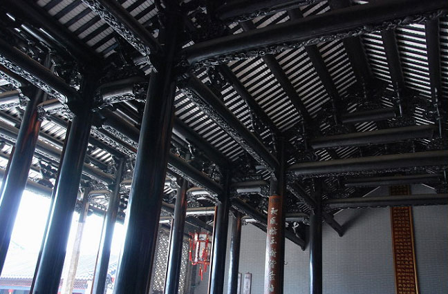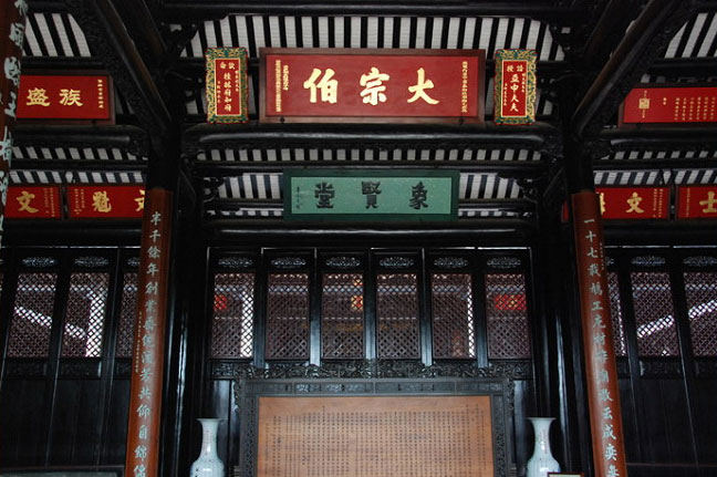 第四进享堂(象贤堂)面阔五间米,进深三间。屋顶与第三进拜庭勾连搭。这里是留耕堂的心脏部位,也就显得最为豪华。内部横向4列、纵向7列共28根巨柱支 承梁架。其中前后檐有4根石檐柱,其他为两人才能合抱的坤甸木柱。梁、枋、驼峰斗拱均有玲珑剔透的三纹鸟兽、花果虫鱼等复杂木雕。