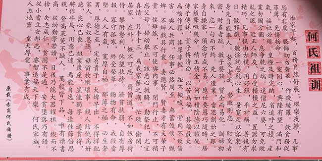 治家起早,百物自然舒展;纵乐夜归,凡事恐有非虞。服饰切勿奢华、作践绫罗。饮食务从非薄,免伤物命。一室同心,兴隆有望。满门和气,福祉必臻。皇粮及时完纳,省追呼之扰。产业勿图方圆,息争兢之端。远僧尼六婆,可免败乱之风。近正人师友,自受楷模之益。置器勿求精巧,凡事俱由古朴,用好银,平计称,善报有日。做邪戏,听淫词惑乱心生。量宽足以容众,身先自能率人。势交者近,势败则忘。财交者密,财吝者疏。教子婴孩,质全而易化。训妇初来,忘一句而不约。先人遗业,当思创业之艰。身自操家,须念守成不易。应世要愚巧随时,居家须聋哑几分。积玉积金,何如积阴德以耀后。传子传孙,贵乎传清白。以苦为福,其福最大。为福作罪,其罪非轻。拒不搬唆,骨肉不致伤害。与人共商,任事必然周至。无蓄后仆、艳婢。不辨戏具行囊。妻应贤,贤妻才有夫荣子贵。仆虽能,不可使与内事。闭门行止,不可稍忘父母。妇幼举止,该悉心教诲。勤祭祀,尤宜真情。月半十三,为我家祭之期,忙碌、偷闲,居家、在外,概不可忘。齐僧道,不如饭房待侍。攀附势力,休望扶持。济贫扶弱,自有厚报。寡守孤寒,终受荣华。物物有命,戒杀当坚。人人有气,宽厚自福。鄙薄之极,必生奢男,厚德之至,定有贵子,大婢早出,不得择配家人。豪奴急逐,勿留放纵坏事。亲人结仇为好恶,良心已丧。祖业众产,岂能独享。过贫得,将作牛马,用意已迷,焉能自逸,每逢佳节倍思亲,登高茱萸不缺人。万般皆下品,唯有读书高。从幼勤学苦读,日后乃能大器耀祖。锲而不舍,矢志成仁,贫困不是过,安贫堕落乃有错。从小当立安邦志,睿智造福天下乐。何氏家族人杰地灵。皇天厚爱,事业有成。