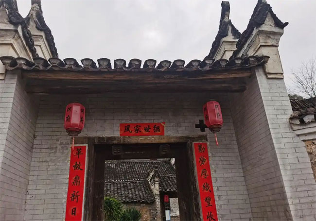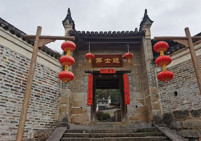 新屋和下新屋之间,相当于古建筑的中轴线,建有八字门楼。这种八字门楼在古代只有衙门和官府才能修建,这和何氏族人崇文重仕有关。这里出过进士10名,秀才40余名,所以才敢在门楼上悬挂“进士第”牌匾。何家当年有公田2000余亩,其所得全部负担何氏子弟的学费和奖励。