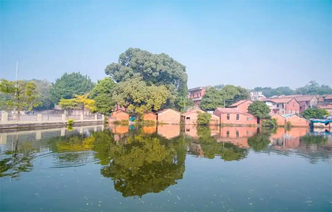 在鲁村的村落边缘,一排红砖小屋静谧地伫立在清澈的溪流旁。屋后,几株古老的树木威严耸立,它们翠绿的身姿倒映在村前水塘的波光粼粼之中, 营造出诗意般的江南画卷,仿佛将人们带入了一幅生动的江南水乡画卷之中。