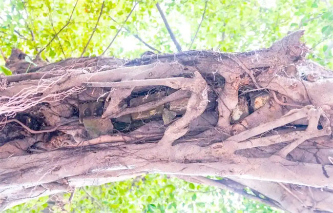 在李沙村,一株独特的树木吸引了人们的目光。这棵树以横向生长的姿态展现,初看之下,仿佛是由三段树干组成的,宛如三棵树并生。然而,长期居住在此的李伯却透露,这实际上是一棵连理树,历经沧桑却依旧枝繁叶茂,见证着村落的变迁与时光的流转。“ 李沙村的连理树经历了从沿着门楼生长到被视为三棵树的独特演变。”李伯,现年87岁,自幼便居住在这棵大树背后的屋子里,亲眼目睹了它的生长与变迁。